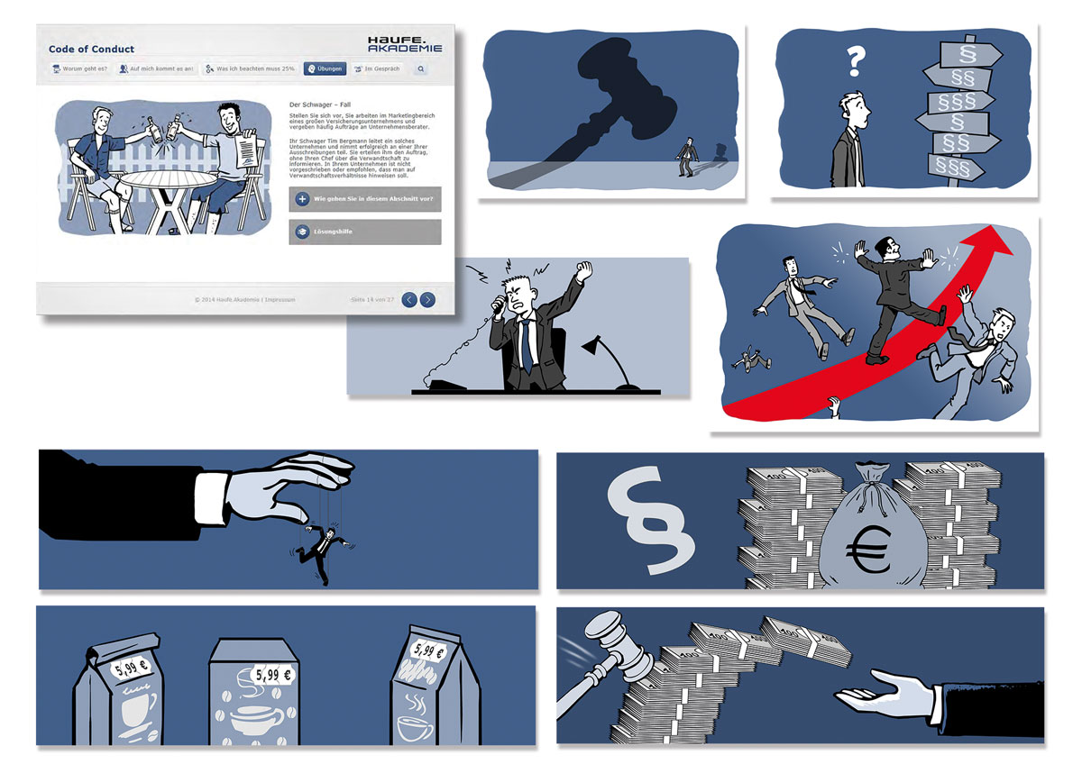 Zeichnungen für das „Haufe Compliance College“ (Bisher 11 E-Learnings mit über 700 exklusiven Bildern und jeweils einer Grob-Animation).